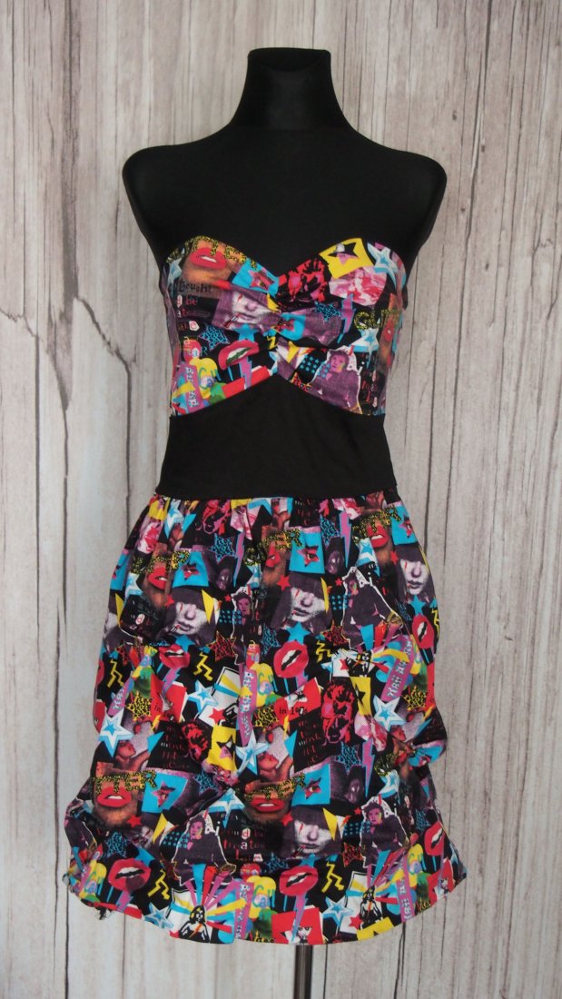 Szalona sukienka marki Hell Bunny. Bez ramiączek, bawełniana (cienki jeans), na podszewce poliestrowej. Sukienka była przerabiana, marszczenia dorobione, ale jest przez to jeszcze fajniejsza, podszewka jest w części wycięta.