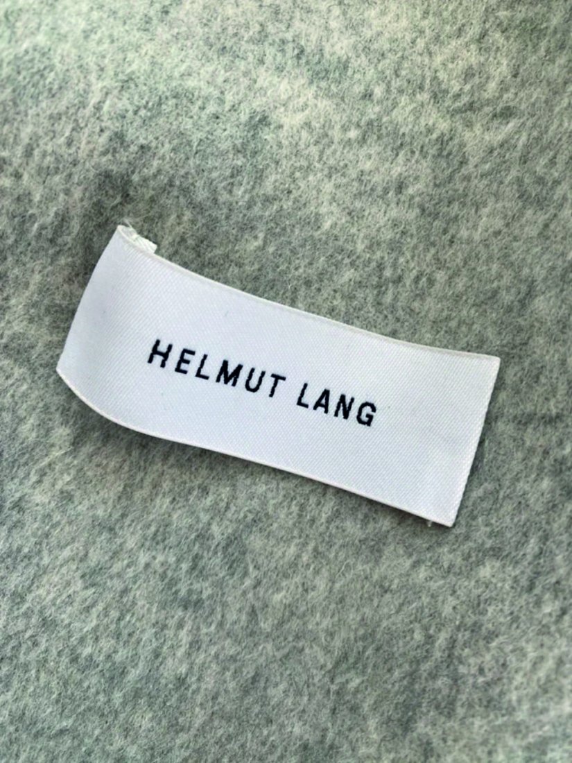 Luźny oversize'owy fason. Naszyte kieszenie. Doskonałej jakości materiał Wełna + Kaszmir w kolorze jasno-szarym. Wykończona czarną lamówką. Częściowa podszewka na plecach i w rękawach. Helmut Lang to nowojorska luksusowa marka odzieżowa stworzona w 1986 roku przez austriackiego projektanta mody Helmuta Langa, znana z charakterystycznego minimalistycznego stylu.