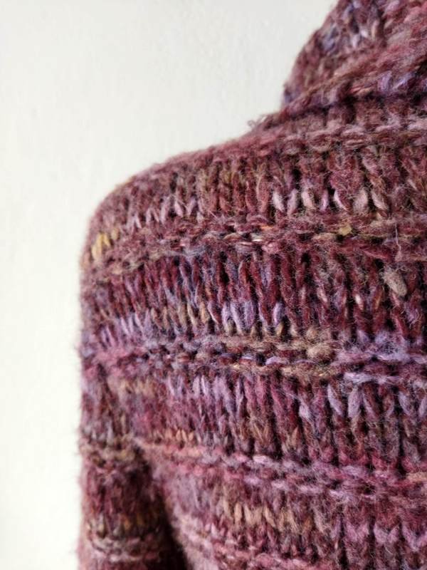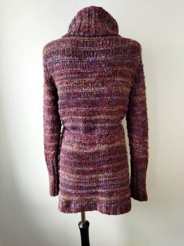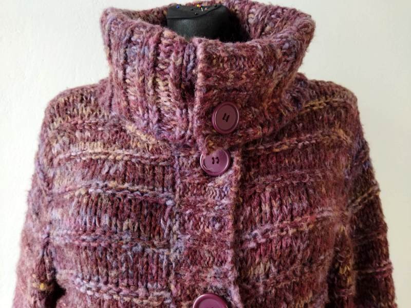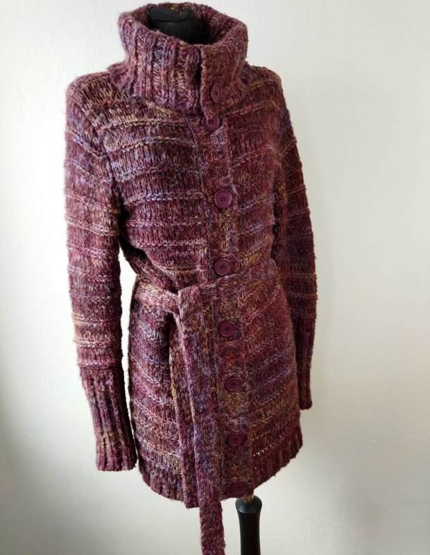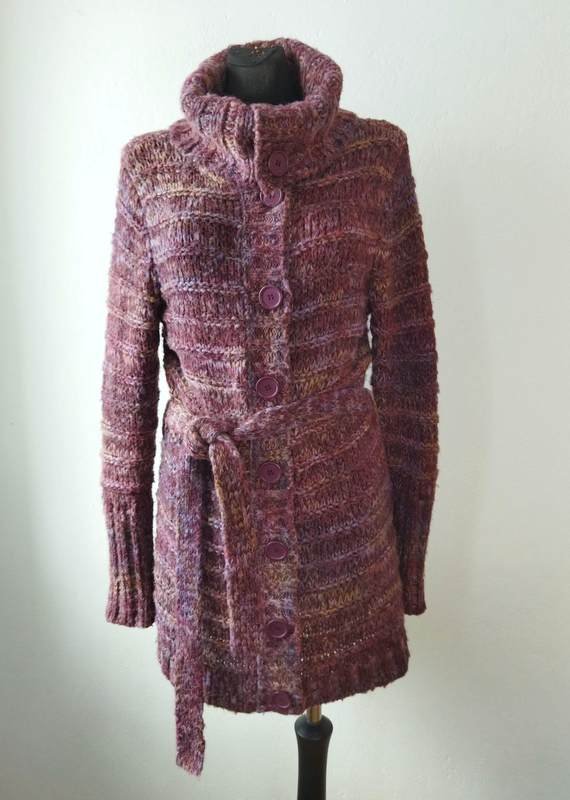 Dłuższy sweter z mięsistej włóczki w melanżowej kolorystyce odcieni fioletu, lawendy, beżu i kasztanowego brązu. Zapinany na całej długości na ozdobne guziki, z dużym wykładanym kołnierzem, z możliwością zapięcia pod samą szyję, wiązany paskiem w talii. Wykończony ściągaczami.