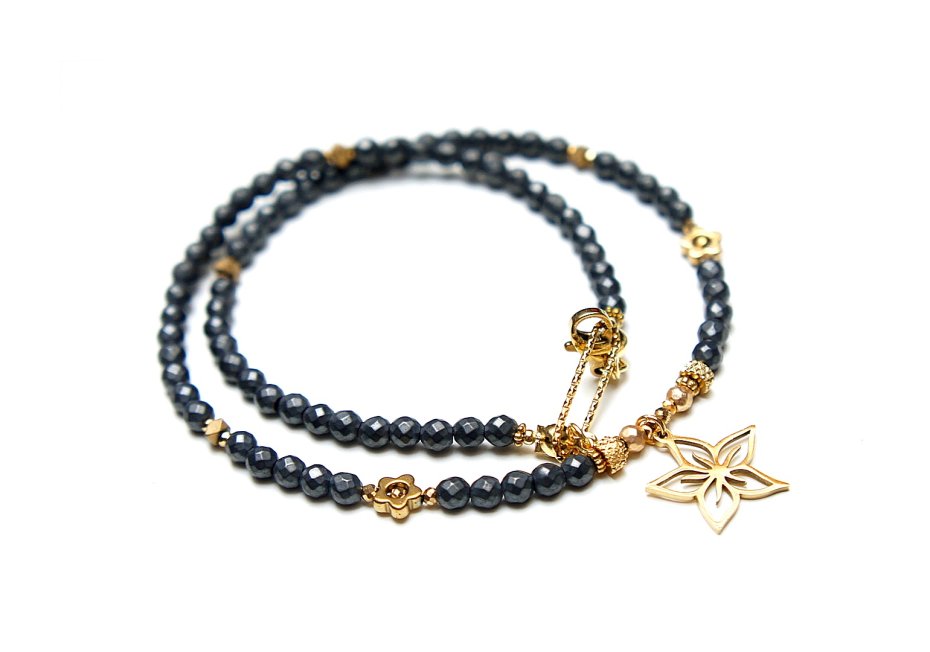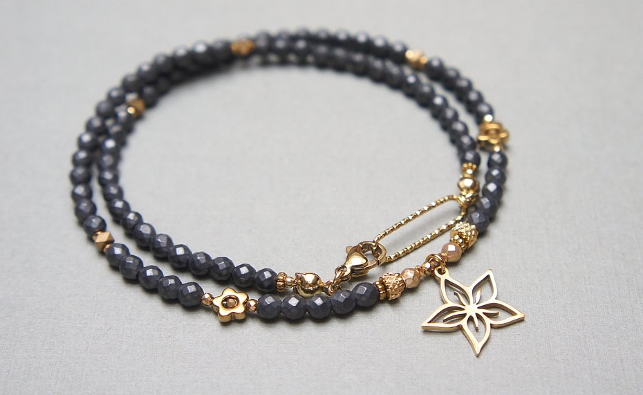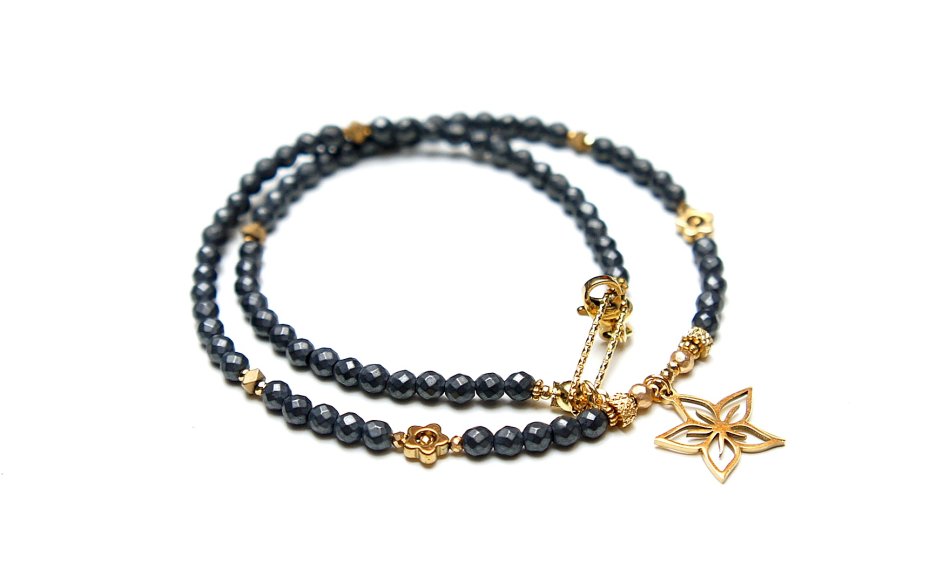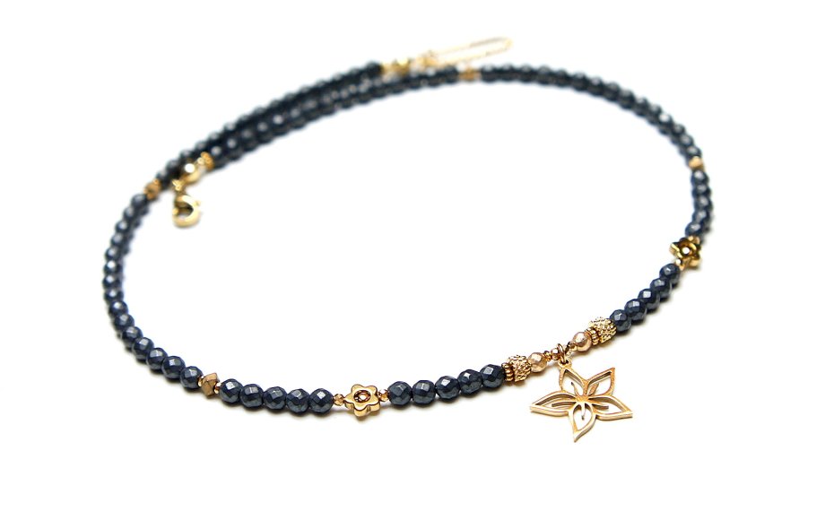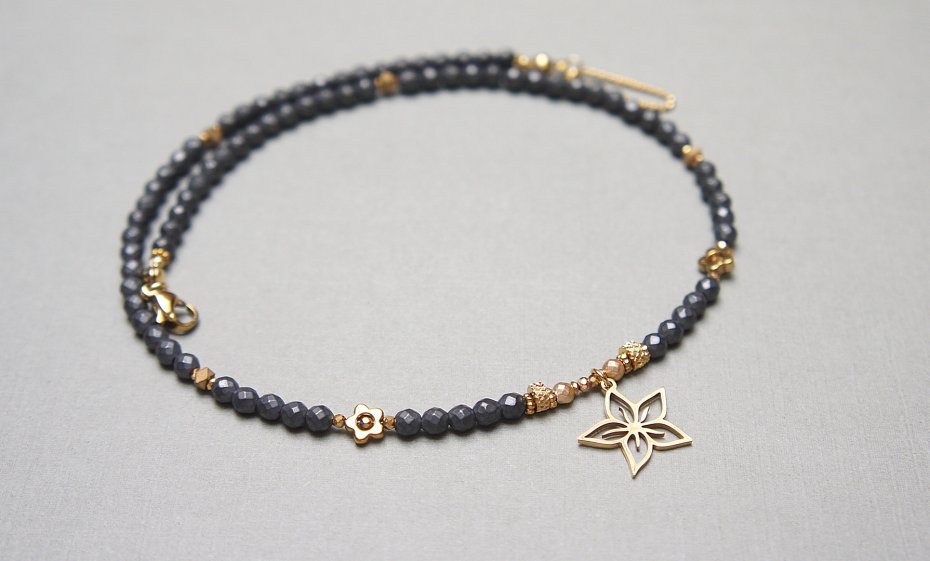 Krótki, delikatny naszyjnik wykonany w całości ze stali szlachetnej pozłacanej oraz naturalnych kamieni - fasetowane, matowe hematyty [4mm], hematyt fasetowany, platerowany [3mm], przekładek z hematytu [3 x 2mm oraz 1mm], kwiatków z hematytu [6mm]. Naszyjnik o długości ok. 41,3cm. Biżuteria ozdobnie zapakowana.