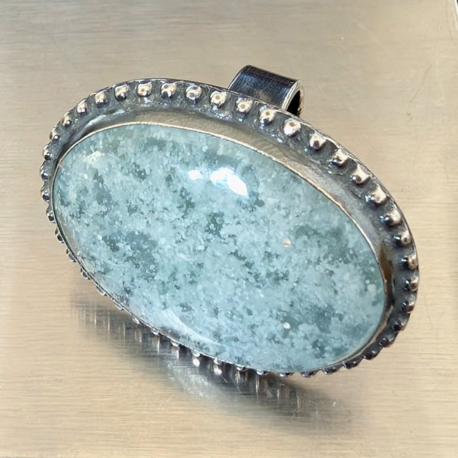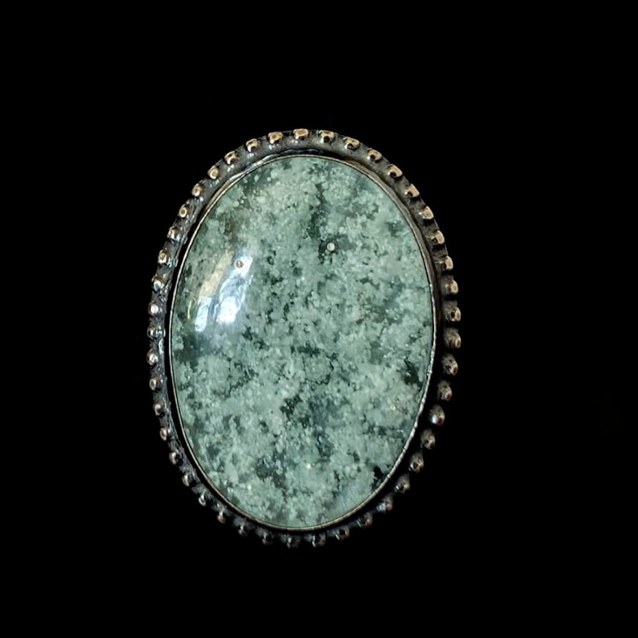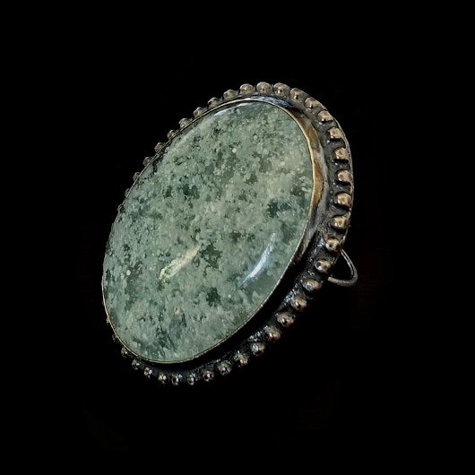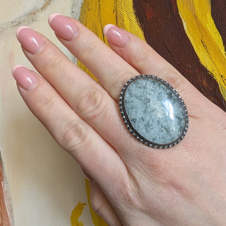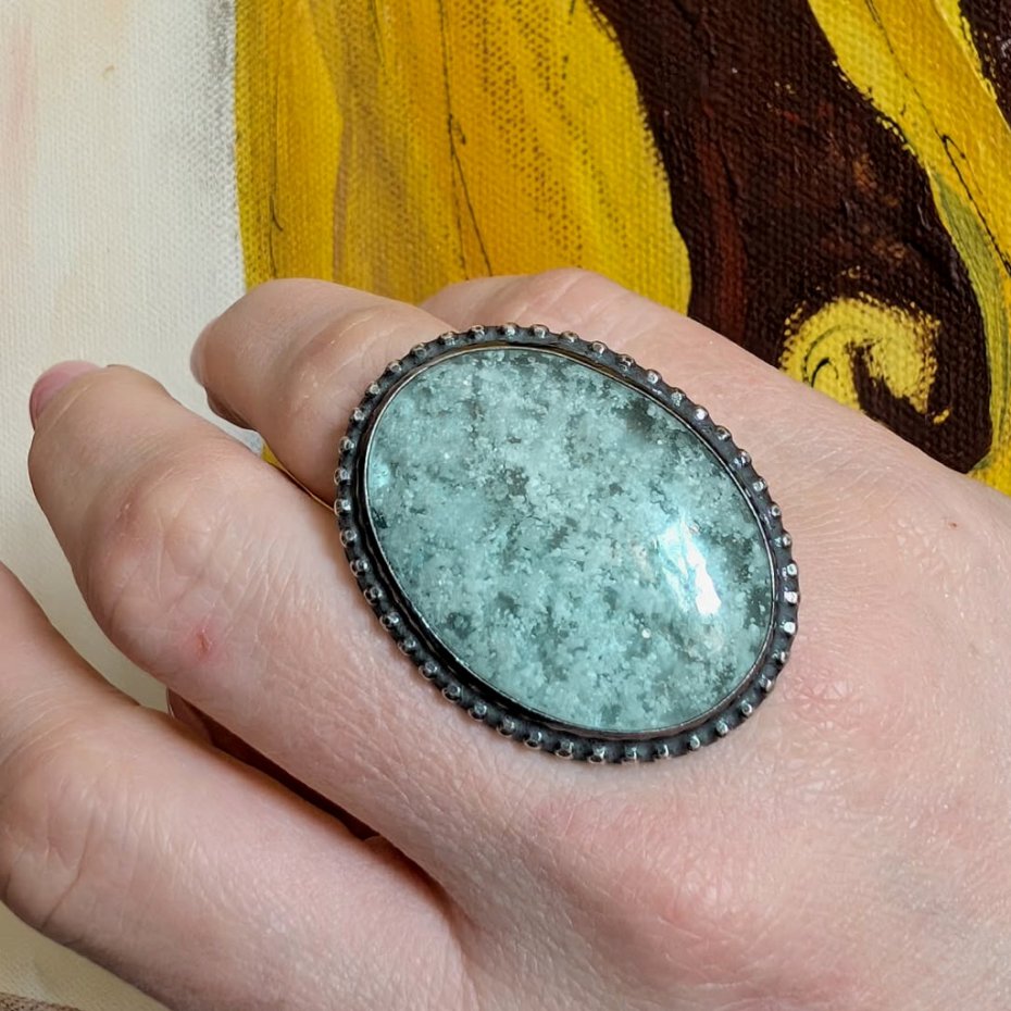 Bardzo okazały pierścień wykonany z oksydowanego srebra próby 925. Ozdobą pierścionka jest niezwykły hemimorfit bubbleone , bardzo ceniony minerał hemimorfit, który ma ciekawą strukturę przypominającą bąbelki, Wymiary pierścienia 38 x 30 mm. Waga 20 g, rozmiar jubilerski mogę dopasować w zakresie 16, mogę powiększyć na max 17. Pierścień wyslany zostanie w ozdobnym pudełeczku.