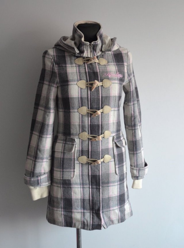 Świetny, markowy płaszczyk firmy HENLEYS. Wełniany. Krój lekko rozszerzany ku dołowi. W dużą kratę utrzymaną w pastelowych kolorach, kremowym, szarym i różowym. Kołnierz w formie stójki. Zasuwany na zamek i zapinany na duże ozdobne kołki. Rękawy długie, zakończone ściągaczami. Z kapturem, kaptur odpinany na zatrzaski. Z przodu duże boczne kieszenie. Całość na podszewce.