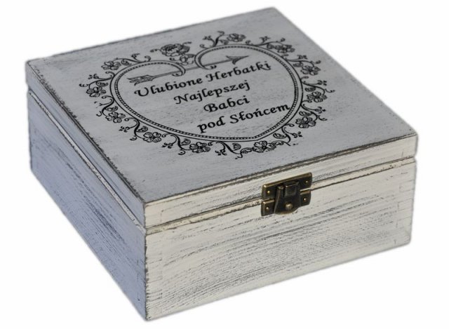 Drewniana herbaciarka - pudełko na herbatę z czterema przegródkami w środku.