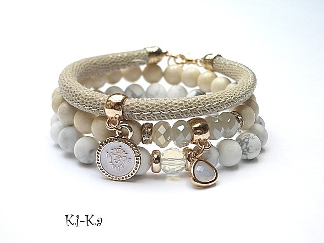 Komplet trzech bransoletek wykonanych z naturalnych kamieni - marmur [8mm],matowe howlity [8mm] kryształki fasetowane [8mm], rzemień z naturalnej skórki [6mm] ,zawieszki w okuciu oraz elementów metalowych w kolorze tzw. różowego złota. Bransoletki pasują na nadgarstek 16-17cm. Biżuteria ozdobnie zapakowana