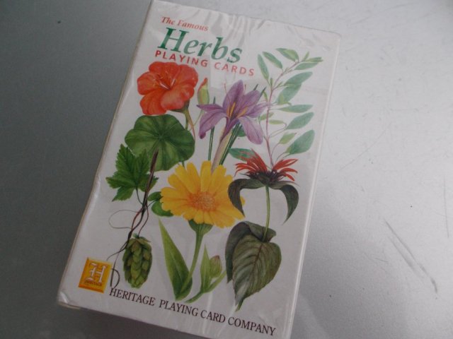Oryginalnie opakowane wielce ciekawe KARTY DO GRY. Zdobienie autorstwa ANN GILLIES, wyprodukowane w Belgii w 1999...i nigdy nie odpakowane. Pudełko z folią. Piękne, kolorowe kwiatowe zdobienie i napisy; The Famous HERBS PLAYING CARDS Heritage Playnig Card Company. Rartyas bez wątpienia :)