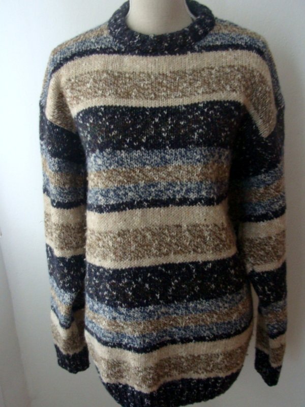 Wełniany , dłuższy sweter włoskiej produkcji w melanżowej mieszance czerni, beżu, jasnego brązu, niebieskiego w ciemnym odcieniu i złamanej bieli Fason luźny, prosty oversizowy, wykończony ściągaczami Model unisex.