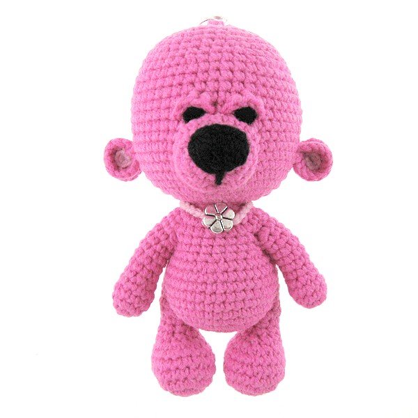 Brelok z szydełkowym misiem. Wzrost misia około 9 cm. Wypełniony specjalnym tworzywem. Kwiatek metalowy.