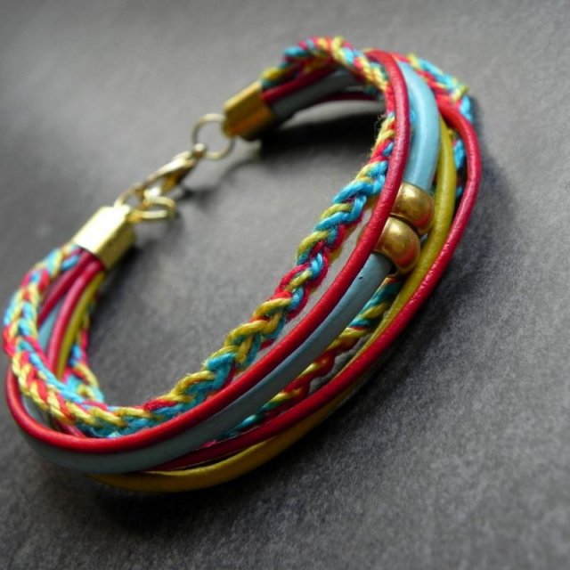 Bransoletka została wykonana z różnorodnych rzemieni skórzanych i ekologicznych, bawełnianego sznureczka oraz elementów w kolorze złotym. Bransoletka będzie odpowiednia na nadgarstek 15-17 cm.