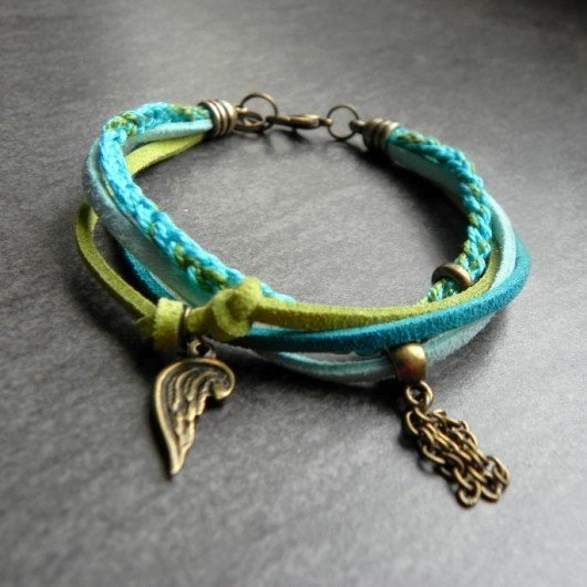 Delikatna bransoletka wykonana została z ekologicznych rzemyków zamszowych, bawełnianych sznureczków oraz elementów w kolorze starego mosiądzu. Bransoletka będzie odpowiednia na nadgarstek 16-17 cm.