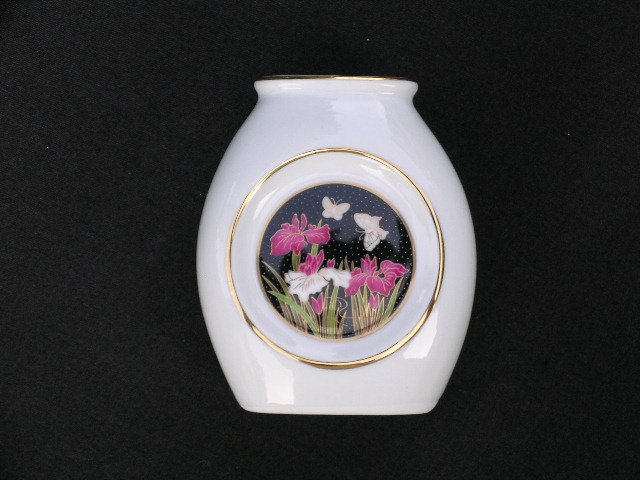 Porcelanowy Wazonik o ciekawym kształcie i inspirowany japońską stylistyką samurajskiej porcelany Chokin. Przestrzenne medalionowe irysowo-motyle zdobienie. Złocenia. Na błyszcząco szkliwiony.
