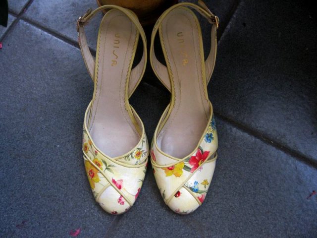 Prześliczne buty hiszpańskiej marki Unisa, ze skóry naturalnej. Raczej niewiele używane, stan bardzo dobry. Kolor ecre w kwiatowy motyw, na koturnie w kolorze limonki. Rozmiar 41, długość wkładki 27cm, ale palce raczej nie dochodzą do końca, Obcas 7cm