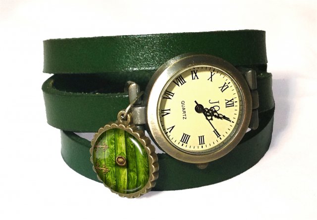 Zegarek ze skórzanym paskiem kilkakrotnie zakręcanym na ręku z ręcznie robioną zawieszką (kaboszonem).