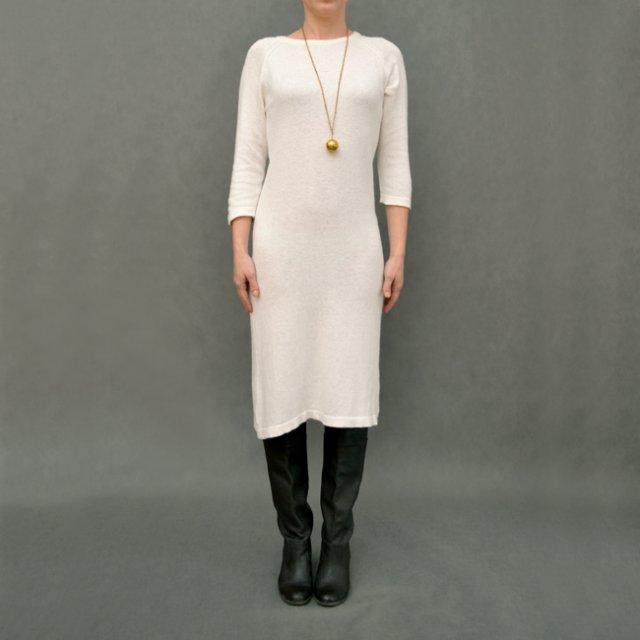 Piękna dzianinowa sukienka w kolorze lekko złamanej bieli. Prościutka, dopasowana. Z tyłu efektowne wiązanie na kokardkę. Polecam.