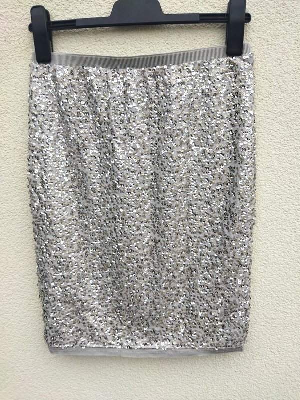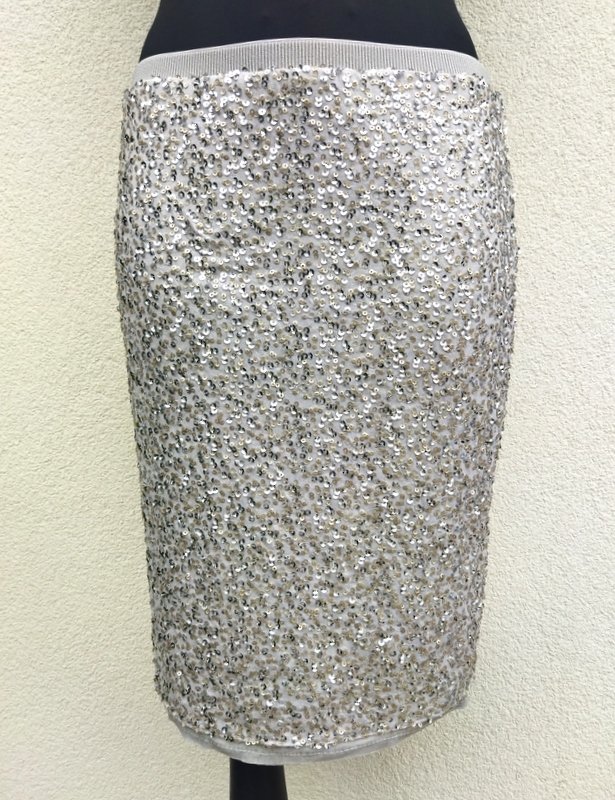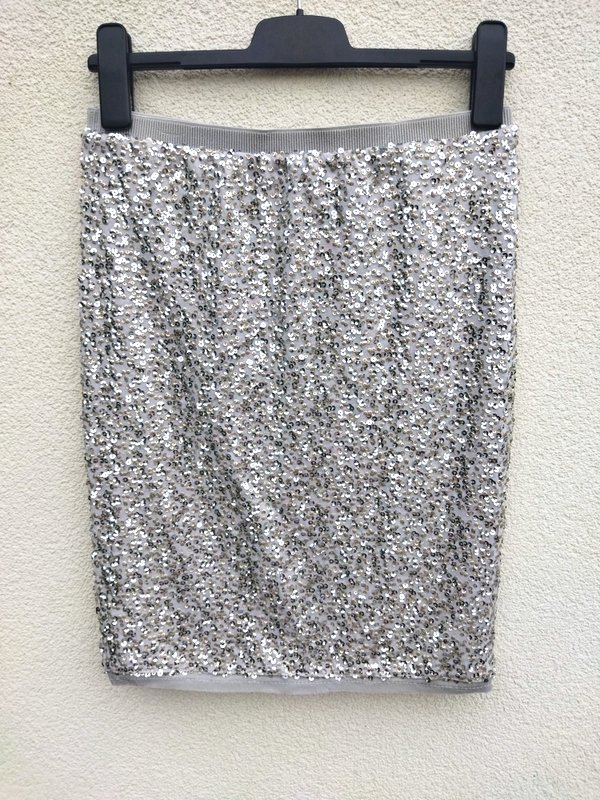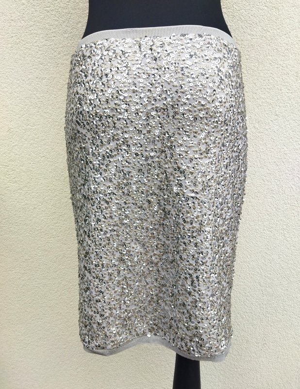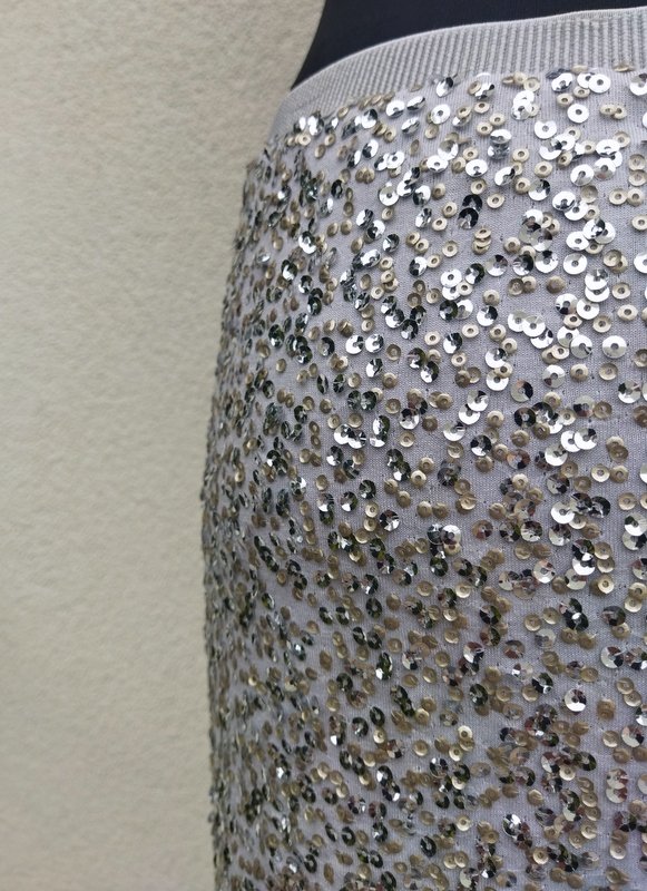 Krótka ołówkowa spódnica z rozciągliwej tkaniny dzianinowej w jasnoszarym kolorze suto pokrytej naszywanymi małymi cekinami w srebrnym kolorze Na gumie w pasie. Wciągana - bez zamka. Na rozciągliwej podszewce w tym samym kolorze.