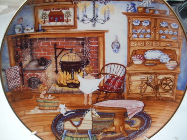 "Saturday night bath " by Karyn E. Bell limited edition Fine Porcelain Franklin Mint HEIRLOOM RECOMENDATION. Uroczy talerz kolekcjonerski z indywidualnym numerem w limitowanej edycji - Ga 2059. Szlachetna porcelana i malatura. Sielskie słodkiego domu przedstawienie. Pełnia domowego szczęścia , nawet napis na obrazku " home sweet home " ;) Wzór lekko wyczuwalny pod dłonią, pod kątem wyraźnie czytelne niuanse. Kolory żywe, miłe dla oka. Wykończenie satynowe I satynowo - błyszczące. Rant złocony. Dodaję profesjonalny uchwyt do powieszenia. Fantastyczna ozdoba, symboliczna dekoracja i prezent góra 20,5 dół 12 wys. Około 2 cm Stan zachowania bardzo dobry minus. Bez pęknięć I uszczerbków i wad. Minimalne ślady użytkowania.