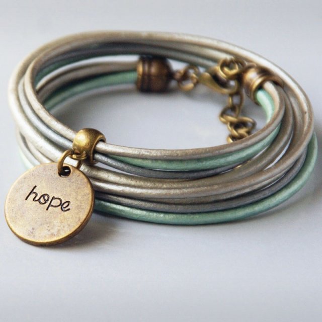 POMYSŁ NA PREZENT ;-) .... teraz bransoletki pełne nadziei w nowej odsłonie kolorystycznej... delikatna bransoletka wykonana z 4 rzemieni ze 100% skórki naturalnej w odcieniach metalicznych/perłowych (po 2 rzemienie 3mm i 2mm) zawieszka dwustronna (gołąbek + "hope" nadzieja) i wykończenie w kolorze antycznego złota. długość regulowana za pomocą łańcuszka. BRANSOLETKA PASUJE NA NADGARSTEK OD 14,5CM. możesz ją nosić samodzielnie lub dowolnie łączyć z innymi bransoletkami z tej serii. świetnie prezentuje się też w zestawieniu z bransoletkami z kamieni naturalnych. ZOBACZ CAŁĄ KOLEKCJĘ!!! ... MOJA BIŻU ZAWSZE PODRÓŻUJE OZDOBNIE ZAPAKOWANA ;-) ...