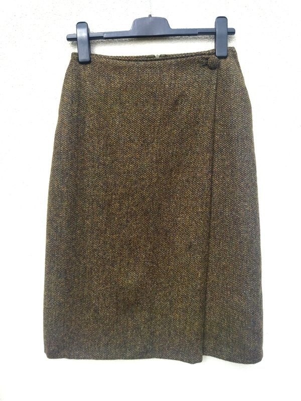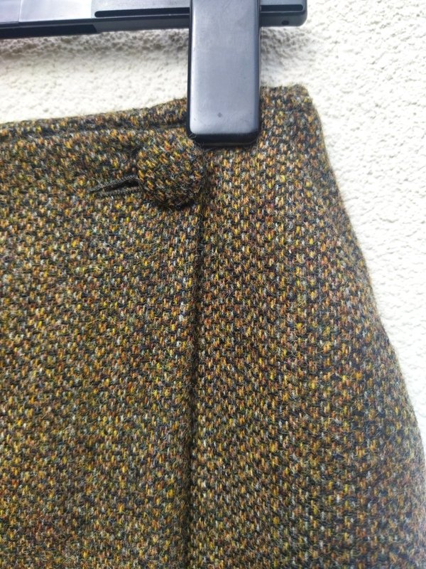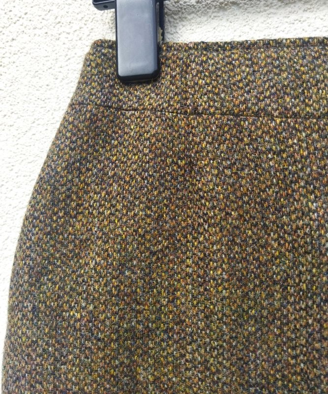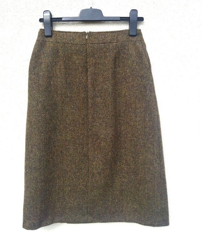 Ciepła spódnica najprawdopodobniej z wełnianej tkaniny z melanżowej kolorystyce z dominacją odcieni brązów. Ołówkowy fason z kopertową nakładką z przodu zapinaną na oblekany tkanina guzik, z dwiema wpuszczanymi kieszeniami. Zapinana z tyłu na zamek . całośc na podszewce