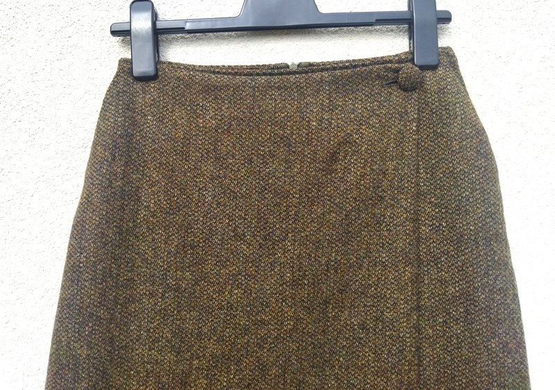 Ciepła spódnica najprawdopodobniej z wełnianej tkaniny z melanżowej kolorystyce z dominacją odcieni brązów. Ołówkowy fason z kopertową nakładką z przodu zapinaną na oblekany tkanina guzik, z dwiema wpuszczanymi kieszeniami. Zapinana z tyłu na zamek . całośc na podszewce