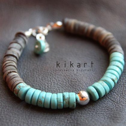 Muszla szara w połączeniu z dyskami howlitu w kolorze turkusowym (średnica 8mm). Dodatki ze srebra próby 925. Długość bransoletki regulowana: ok. 19-21,5cm. Polecam :)
