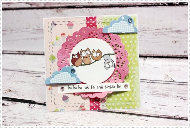 Zabawna, przestrzenna i bardzo kolorowa kartka urodzinowa z sówkami i napisem "hu hu hu, jak ten czas szybko leci". Na pewno wywoła uśmiech na twarzy obdarowanej osoby. Rozmiar 13,5 x 13,5 cm.