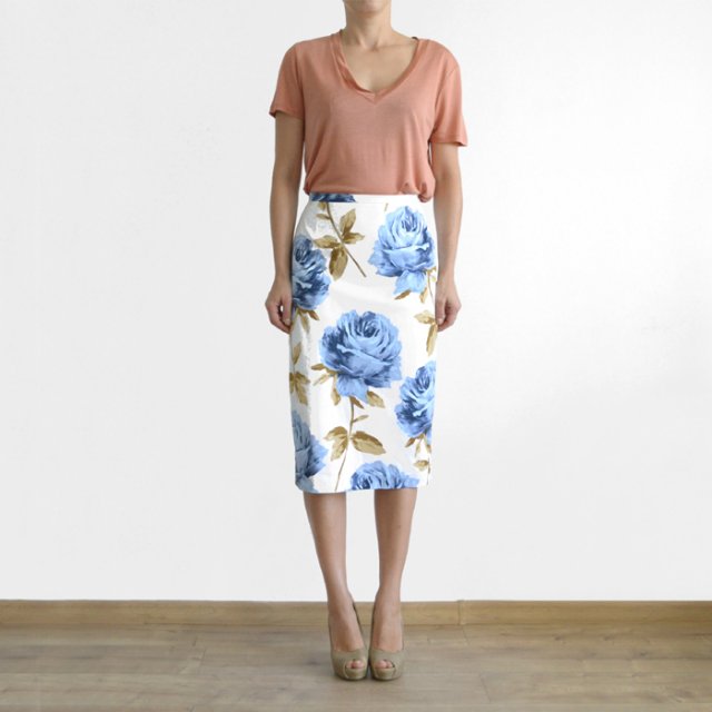 Piękna, ołówkowa spódnica w duże niebieskie róże. Z boku zapinana na zamek. Na podszewce.