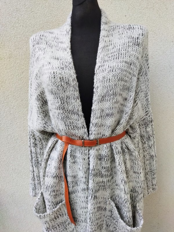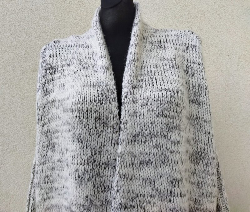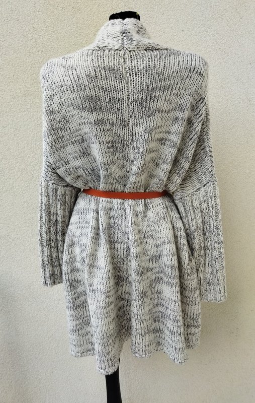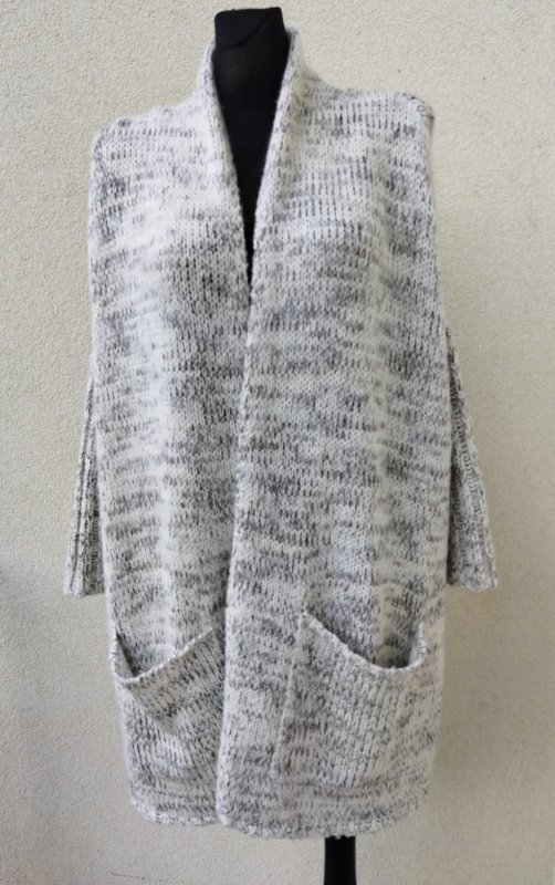 Luźny sweter stylizowany na poncho z grubszej akrylowej włóczki w melanżowej kolorystyce bieli z szarością. Rękawy niżej doszywane, rozcięcia po bokach od rękawa w dół, u dołu dwie naszywane kieszenie. fason otwarty- bez zapięcia, dobrze wygląda również z paskiem - sprzedawany bez paska ze zdjęcia. Może zastąpić okrycie wierzchnie.