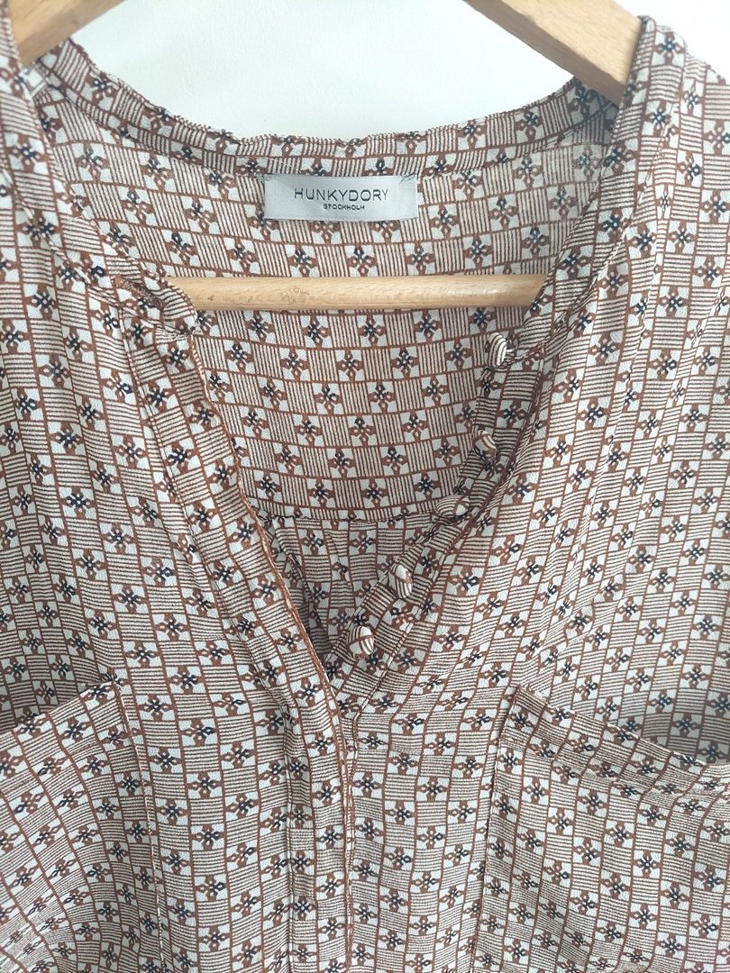 bluzka uznanej szwedzkiej marki hunkydory. materiał lekko transparentny brak metki, ale na 100% wiskoza. fason prosty. Rozmiar z metki L. stan bardzo dobry. proszę sprawdzić wymiary