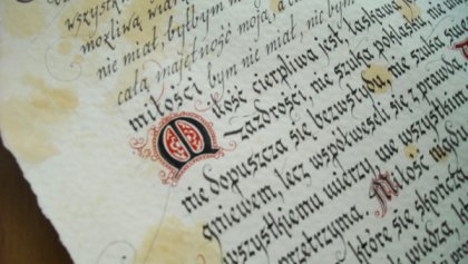 Biblijny tekst, Hymn o miłości, kaligrafowany na podbarwionym papierze.