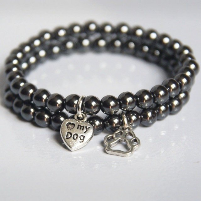 POMYSŁ NA PREZENT ;-) ... komplet 2 delikatnych bransoletek dla wielbicielki psów. bransoletki na solidnej lince elastycznej, wykonane z grafitowego hematytu (kuleczki 6mm) oraz uroczej, metalowej przekładki - serduszka ( łapka + love my dog) i łapki.... KOMPLET PASUJE NA standardowy NADGARSTEK - OBW. WEWNĘTRZNY: 16CM.... (na życzenie mogę wykona inny rozmiar) ...HEMATYT - Ułatwia wchłanianie żelaza. Reguluje nadciśnienie. Pomaga w dolegliwościach kręgosłupa. Budzi radość życia, dodaje odwagi i umacnia wolę.W astrologii przypisany jest znakom Barana i Skorpiona... ZOBACZ CAŁĄ KOLEKCJĘ! ... moja biżu zawsze podróżuje w ozdobnym opakowaniu handmade :D ...