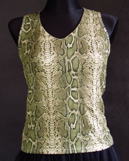 Mała bluzeczka .Materiał syntetyk.Nadruk skóra węża.Dekolt wycięty w szpic.Rozmiar S.Długość 55cm,biust 86cm.Kolor oliwkowy.