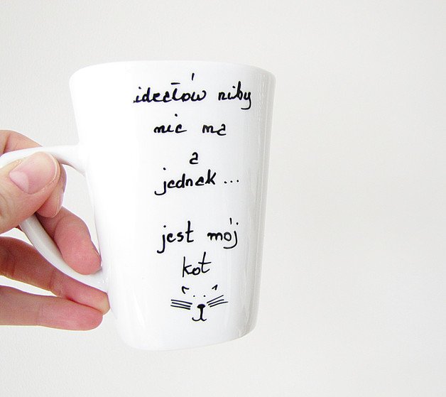 Witaj mój przyszły użytkowniku. Jestem ceramicznym kubkiem o pojemności 300 ml, na którym pojawił się malowany ręcznie napis. Dbaj o mnie myjąc ręcznie w ciepłej wodzie, nie szoruj wzoru a będę Ci towarzyszył przez długi czas.