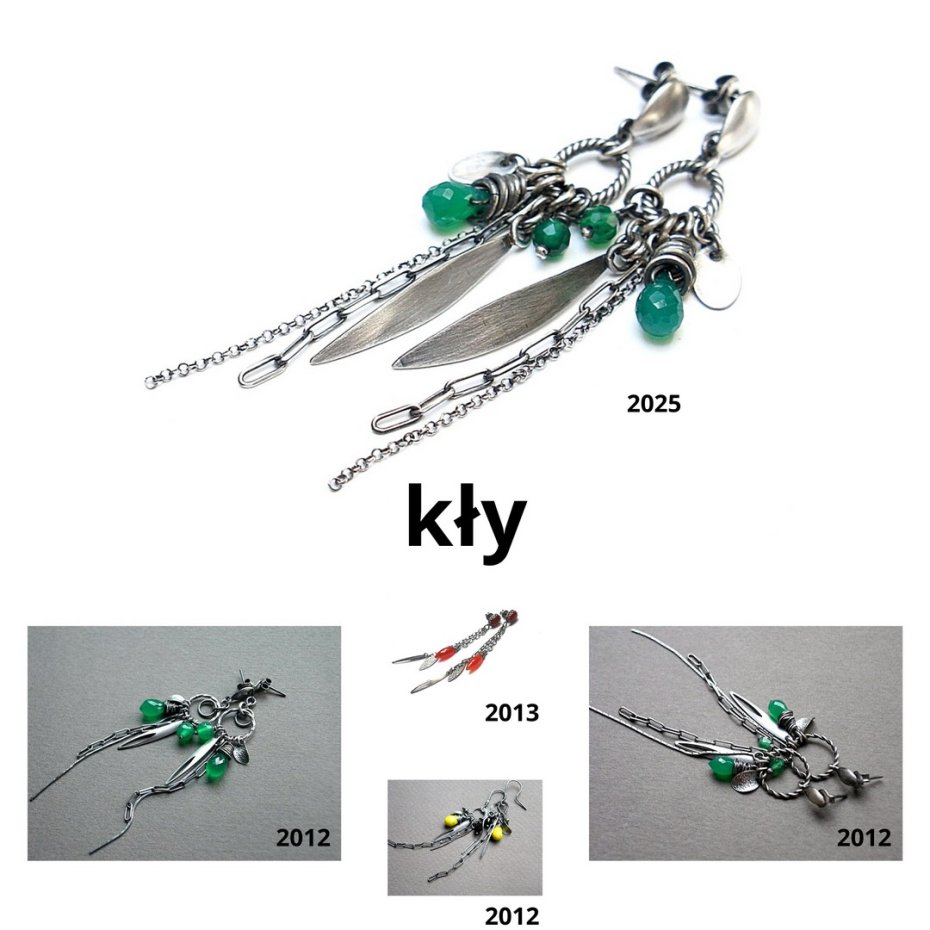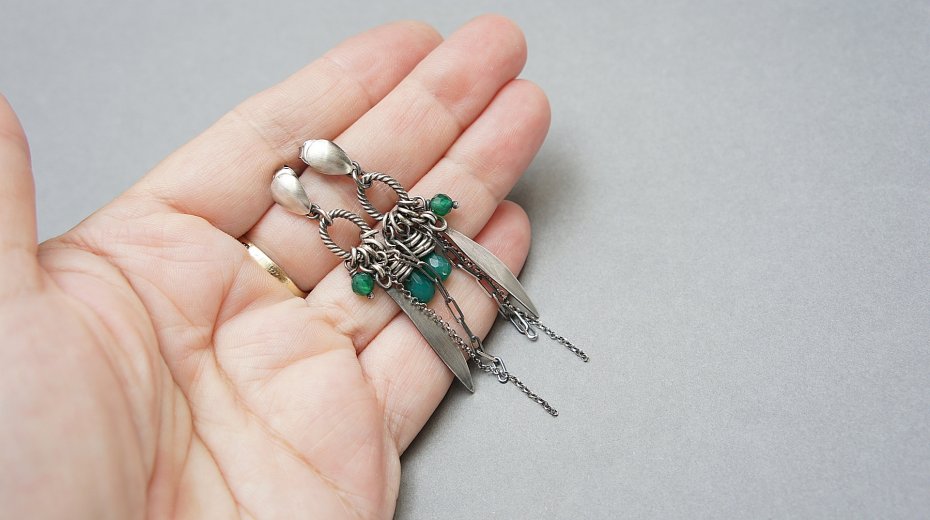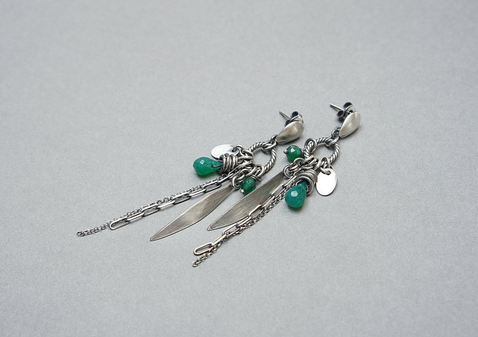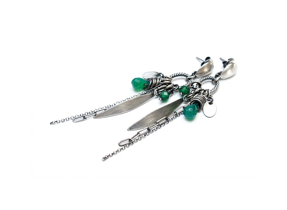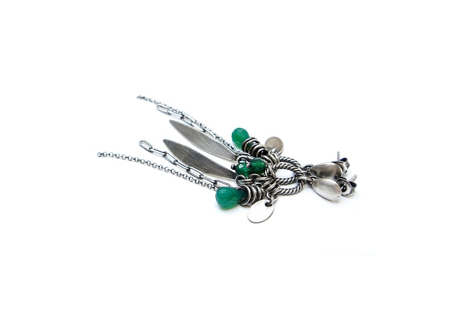 Kolczyki wykonane ze srebra [pr. 925] w połączeniu z brioletkami zielonych onyksów [8mm], fasetowanymi kuleczkami zielonych agatów [4mm] oraz srebrnymi przywieszkami. Całość oksydowana i przetarta. Całkowita długość kolczyków ok. 7,4cm. Biżuteria ozdobnie zapakowana