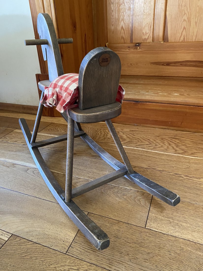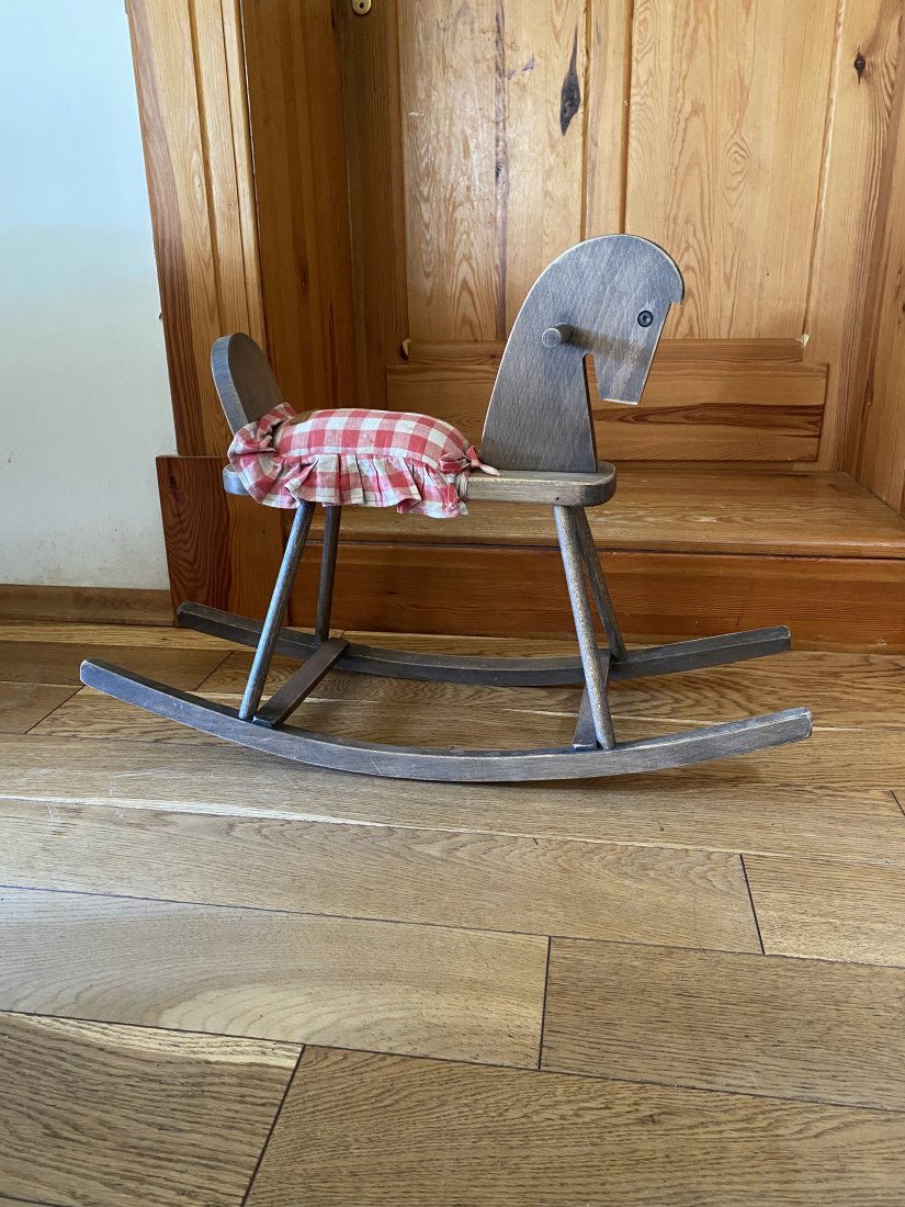 Drewniany konik na biegunach z lnianym siedziskiem w kratę. Stan bdb.