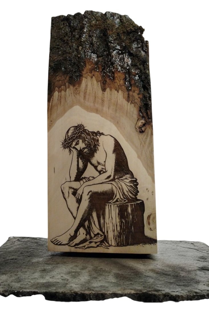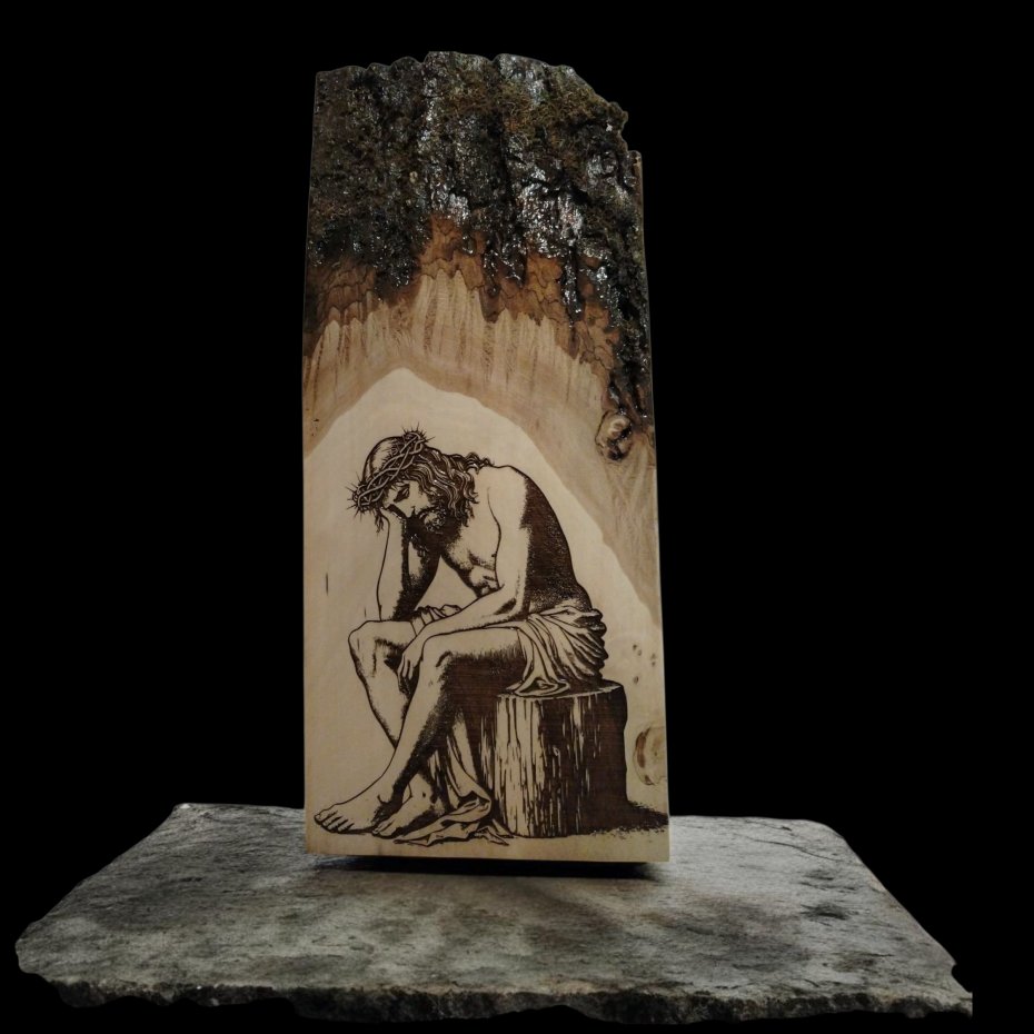 Przedstawiamy Państwu unikalną ikonę Chrystusa Frasobliwego, stworzoną w naszej podkarpackiej pracowni "Majsternia Drewna Drewnica". Praca ta jest połączeniem nowoczesnej precyzji grawerowania laserowego z surowym pięknem naturalnego drewna lipowego.