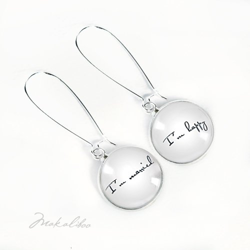 Sympatyczne kolczyki - idealne na prezent nie tylko dla Panny Młodej. Autorska grafika ukryta pod 18 mm szkiełkiem , baza w tonacji srebrnej. Długość kolczyków 5,5 cm średnica graficznej miniatury 18 mm.