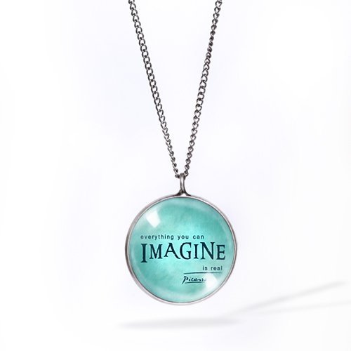 Wybierz sympatyczny naszyjnik, z kolekcji Złote Myśli. sentencja Pablo Picasso Everything you can imagine is real. ukryta pod 20 mm szkiełkiem, baza naszyjnika w kolorze ciemnego srebra, łańcuszek 48 cm. Projekt autorski.