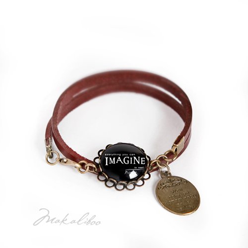 Everything you can imagine is real. Napis niczym sekret - ukryłam pod 18 mm szkiełkiem, rzemyk z naturalnej skóry, szeroki na 5 mm ,oplata nadgarstek 2 x, baza zawieszki oraz zapięcie w tonacji antycznego złota. Rozmiar regulowany, pasuje na nadgarstek 14 - 15,5 cm. Jeśli potrzebujesz inny rozmiar - napisz. Projekt autorski. Wszystkie prawa zastrzeżone.