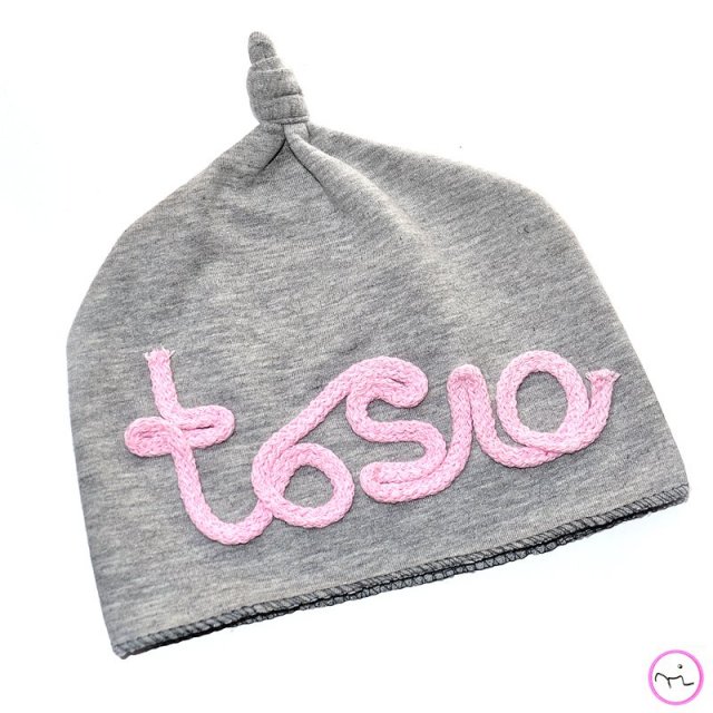 Śliczna czapeczka z szarej dzianiny dresowej oraz bawełnianego sznurka. Możliwość zamówienia dowolnego rozmiaru czapeczki i innego koloru sznurka (różowy ciemny, różowy jasny, fioletowy, biały, ciemny niebieski). Na czapeczce zmieszczą się imiona z maksymalnie 5 liter. Czas oczekiwania na wykonanie zamówienia do 7dni.