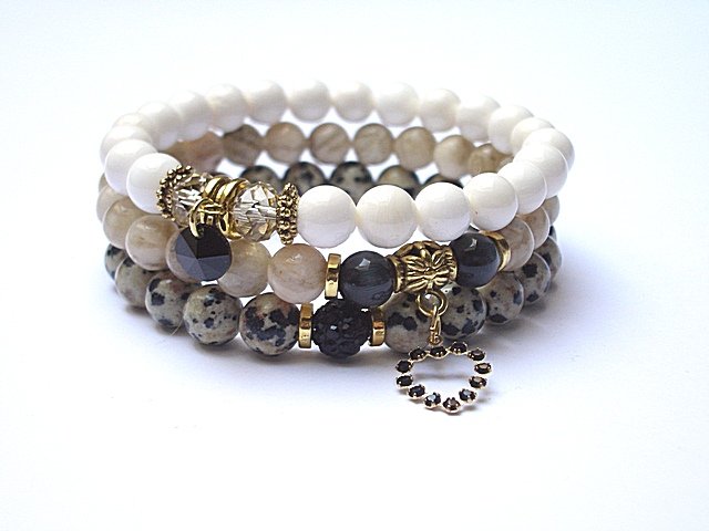 Komplet trzech bransoletek wykonanych z naturalnych kamieni - jaspis [8mm], muszla [8mm], uleksyt [8mm], kuleczki shamballa wysadzanej kryształkami Swarovskiego, przywieszki z kryształkiem Swarovskiego, przywieszki, zawieszki z metalu pokrytej srebrem pr. 925 [pozłacanej 18k złotem] i wysadzanej kryształkami Swarovskiego [Jet] 19 x 12mm], kryształków fasetowanych [6 x 8mm] oraz elementów metalowych w kolorze złota. Pasują na nadgarstek 16-17cm . Biżuteria ozdobnie zapakowana