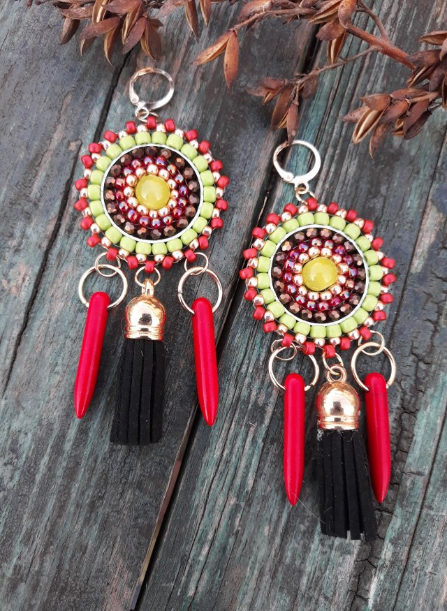 ,,indiańce z chwostem,,to kolorowe kolczyki wykonane na obręczach ze szklanych koralików i kryształków w różnych odcieniach brązu, zieleni, złota i czerwieni. Całości kolczyka dopełnia żółty koralik kwarcu, czerwone kolce z howlitu i czarny zamszowy chwost. Kolczyki zawieszone są na ozdobnych biglach typu kajdanki w kolorze złota.