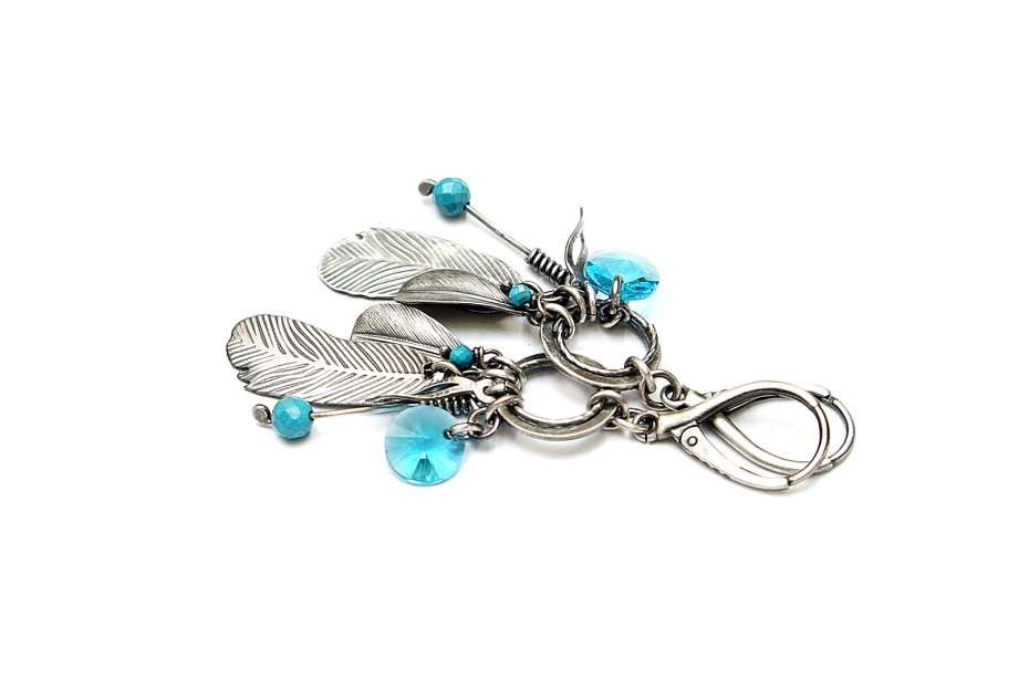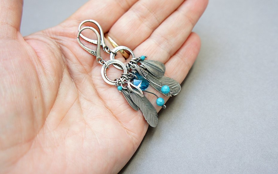 Kolczyki wykonane ze srebra [pr. 925] w połączeniu z kryształkami [8mm] ,fasetowanymi kuleczkami magnezytu [4mm i 2mm] oraz srebrnymi piórkami. Całość oksydowana i przetarta. Całkowita długość kolczyków 6,4cm. Biżuteria ozdobnie zapakowana.