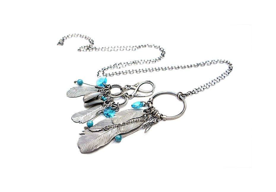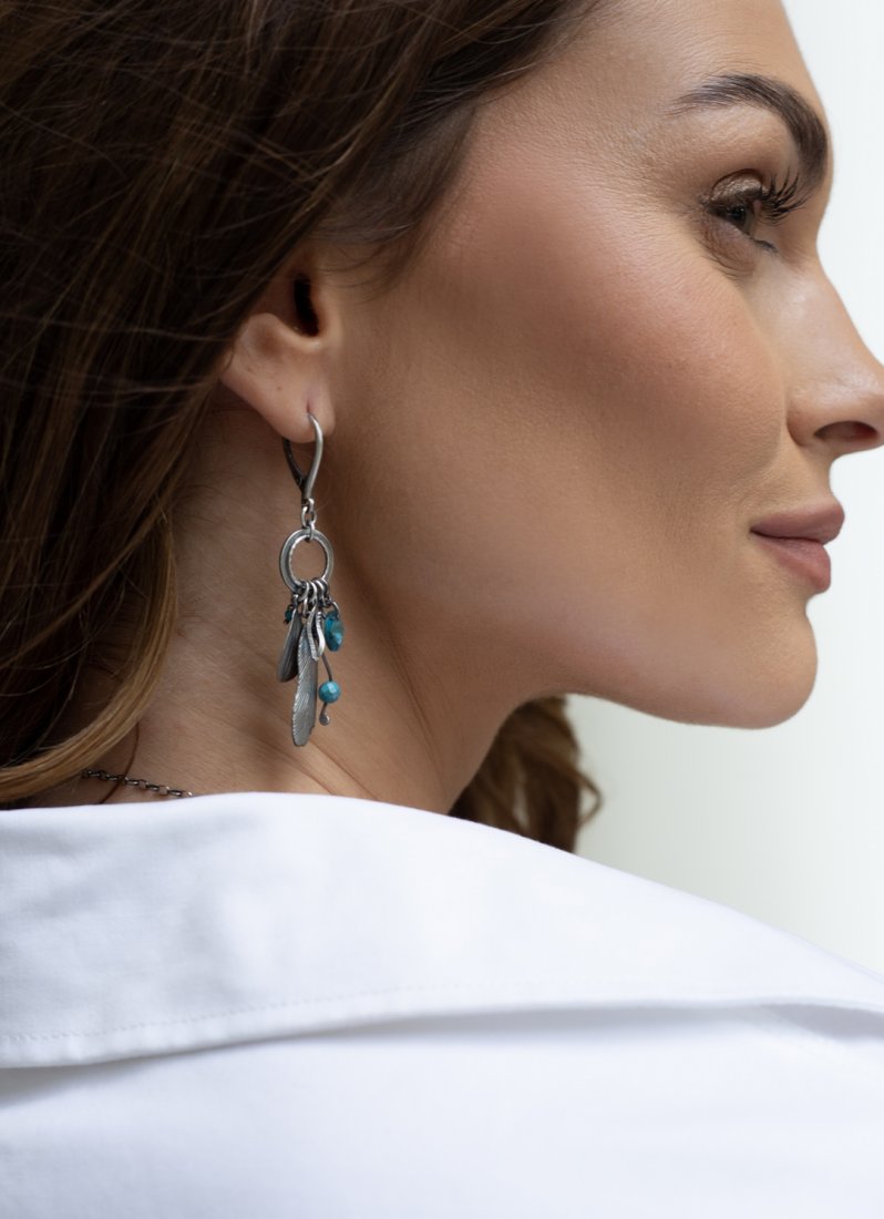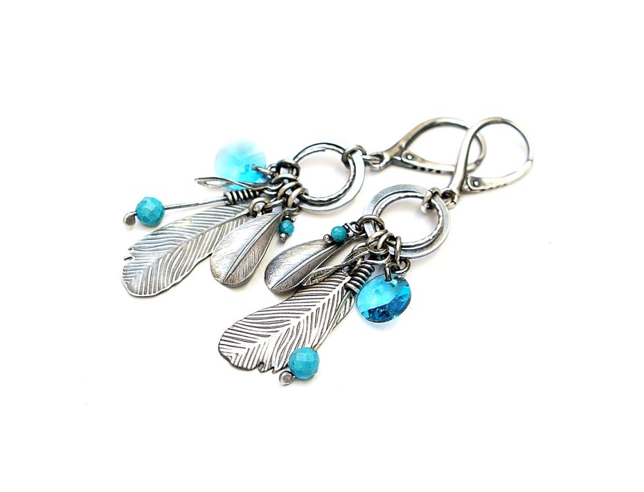 Kolczyki wykonane ze srebra [pr. 925] w połączeniu z kryształkami [8mm] ,fasetowanymi kuleczkami magnezytu [4mm i 2mm] oraz srebrnymi piórkami. Całość oksydowana i przetarta. Całkowita długość kolczyków 6,4cm. Biżuteria ozdobnie zapakowana.