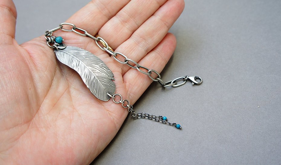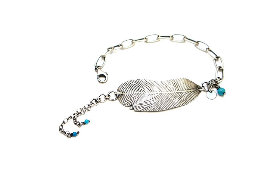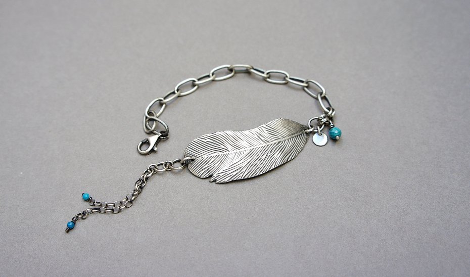 Bransoletka wykonana ze srebra pr. 925 w połączeniu z fasetowanymi kuleczkami magnezytów [4mm i 2mm] oraz srebrnym piórkiem [48mm]  . Srebro oksydowane i przetarte. Całkowita długość bransoletki 19cm plus dodatkowe ogniwo i ozdobna przedłużka .