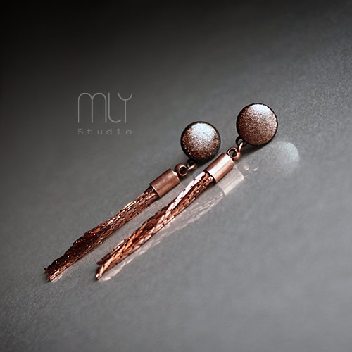 Efektowne kolczyki w formie sztyftów, ręcznie wykonane z delikatnej czekoladowobrązowej gliny kamionkowej, jednostronnie szkliwione efektownym połyskującym drobinkami szkliwem w kolorze brązowym, na sztyftach w kolorze miedzi.średnica elementu ceramicznego ok. 6mm, długość miedzianych łańcuszków ok 3,5cm. Polecam