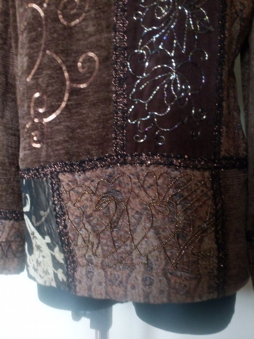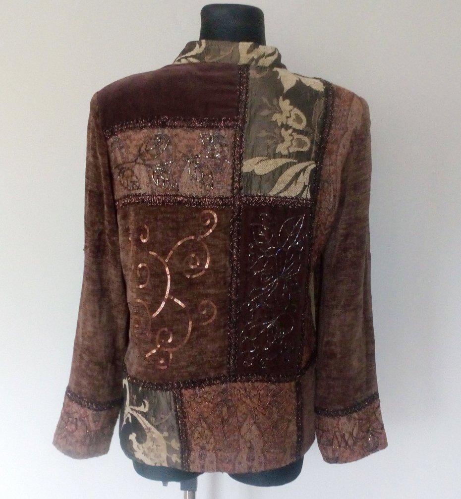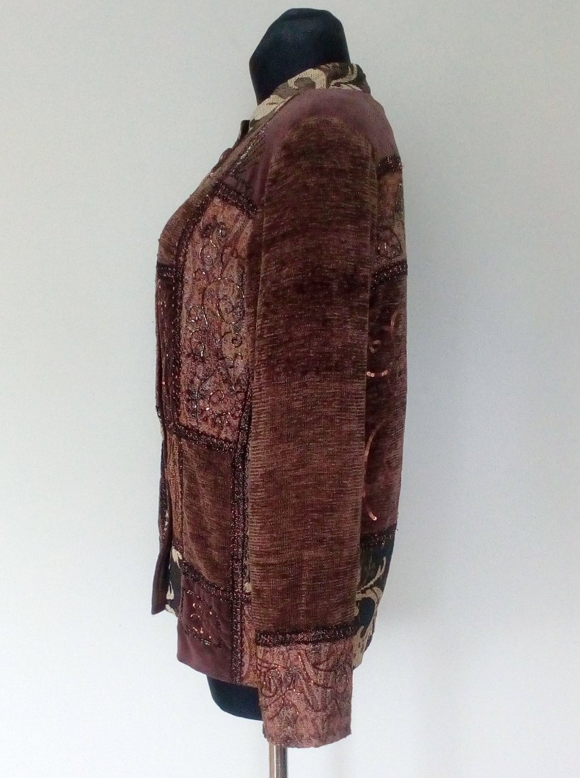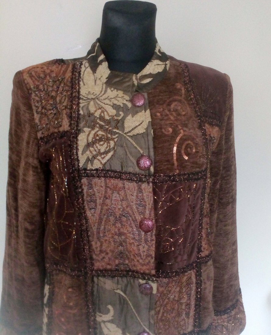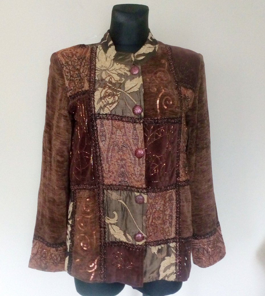 Wzorzysta wiskozowa kurtka o żakardowej fakturze materiału w kolorystyce brązu, starego złota, beżu. Niepowtarzalnego charakteru nadają jej piękne cekinowe wzory, hafty i oryginalne guziki . Całość na podszewce. W realu ładniejsza.