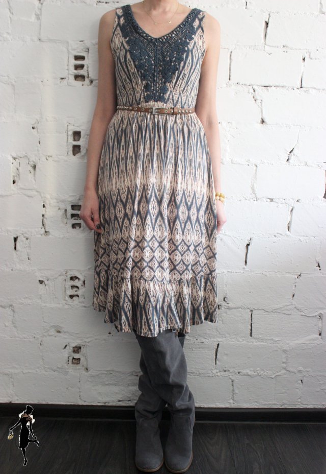 Sukienka z ozdobnym, koronkowym wykończeniem dekoltu. Firma Indigo. Rozmiar z metki 38/M. Wymiary: obwód biustu-50cmx2 (mierzony od pachy do pachy), obwód pasa-45cmx2 (regulacja gumką), obwód bioder-66cmx2, długość sukienki-115cm. Skład materiału: 100% wiskoza.