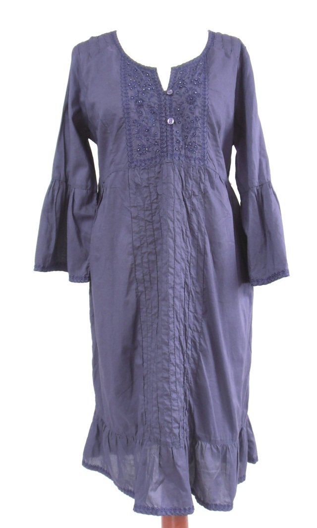 Filoletowa sukienka firmy INDISKA.Rozmiar L.Materiał bawełna.Odcięta w pasie.Z przodu rozcięcie,zapięte na guzik.Przód ozdobiony haftem i koralikami.Dół marszczony z przodu szczypanki.Rękaw długi,zakończony falbaną dł.20 cm.+haft.Dól z doszytą falbaną.Stan dobry+.Długość 102 cm.pod pachami 112 cm.