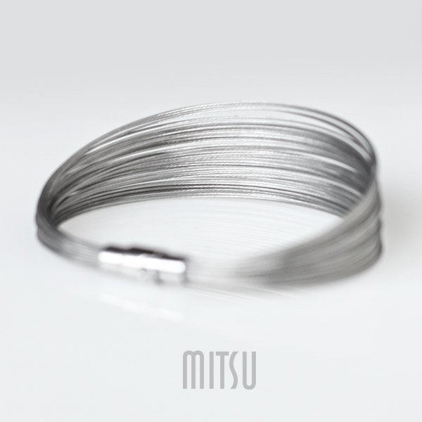 Minimalistyczna, industrialna bransoleta, zbudowana ze stalowych linek krytych nylonem w srebrnym kolorze, Zapinana na magnetyczne zapięcie z blokadą. Opakowanie hand made. Rozmiar: S: 18cm. Prosta, nowoczesna, neutralna.