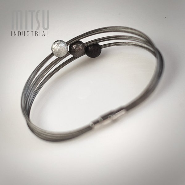 Elegancka bransoleta na magnetyczne zapięcie z blokadą. Zbudowana ze stalowych linek krytych nylonem i teksturowanych akrylowych kul w odcieniach srebra. Podróżuje ładnie zapakowana. Polecam :) Rozmiar 19 cm [aby zamówić inny rozmiar bardzo proszę o info w opcjach wyboru]