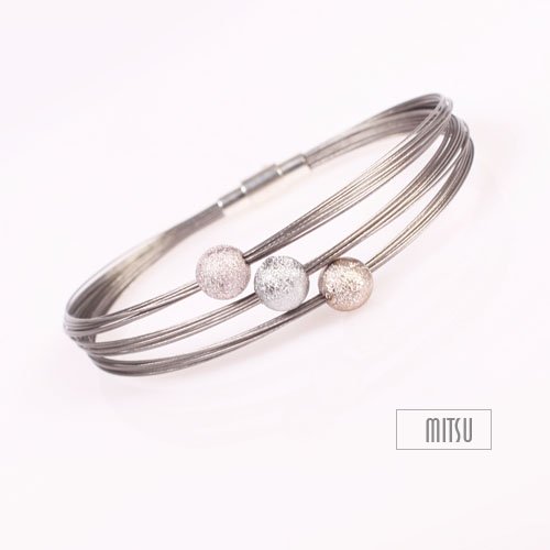 Industrialna, minimalistyczna bransoleta, zbudowana ze stalowych linek krytych nylonem, i akrylowych teksturowanych kul o średnicy 8mm. Kule są w srebrnej tonacji, w trzech różnych odcieniach: beżowy, stalowy, fioletowy. Zapięcie na magnes i blokadę. Bransoleta podróżuje w torebeczce ręcznie wykonanej. Polecam :) Rozmiar: 18cm